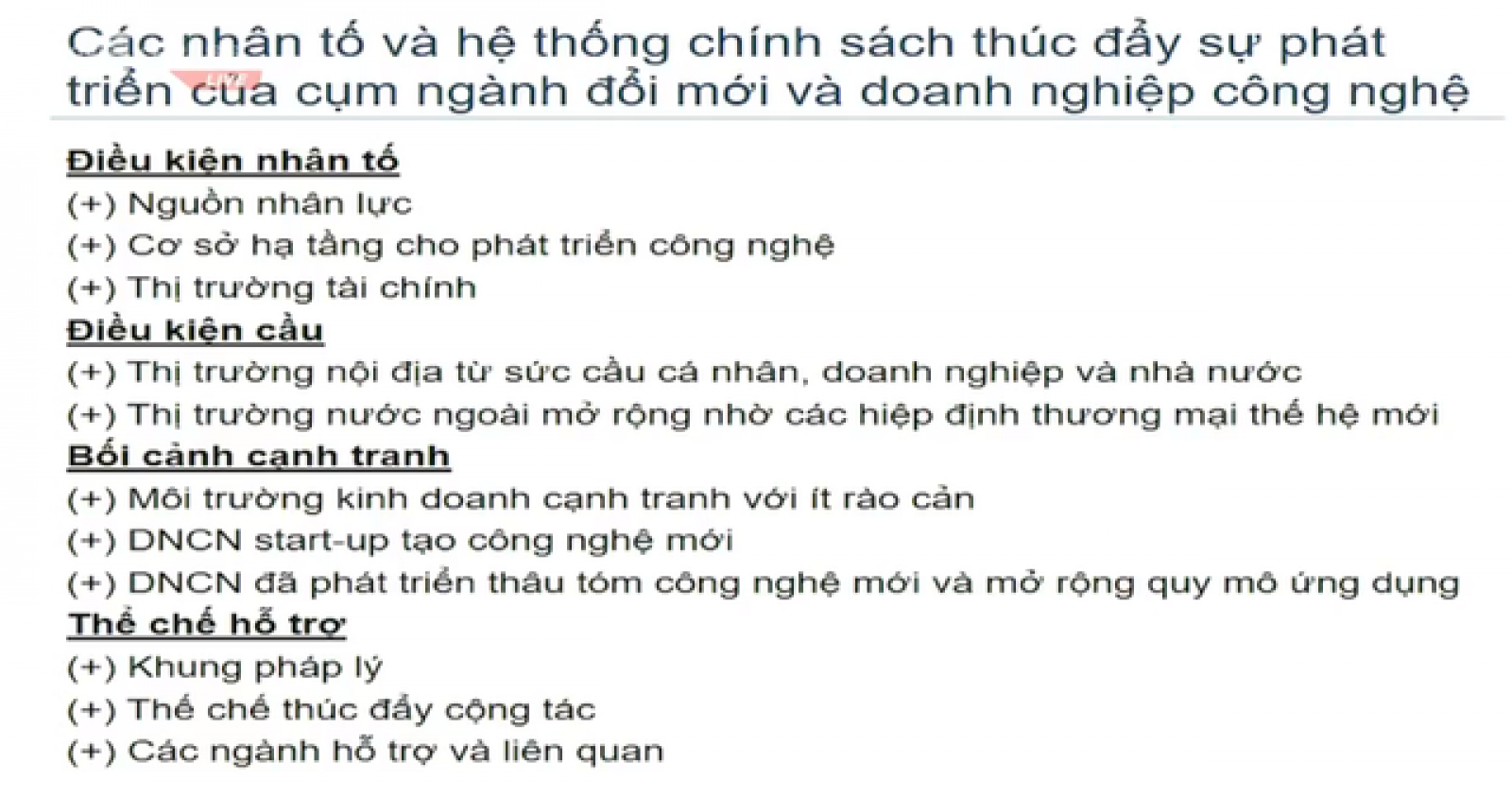 Góp ý về mặt chính sách để phát triển những cụm ngành đổi mới này, ông Thành cho rằng cần chú ý tới 4 nhân tố gồm: Điều kiện nhân tố, Điều kiện cầu, Bối cảnh cạnh tranh, Thể chế hỗ trợ.